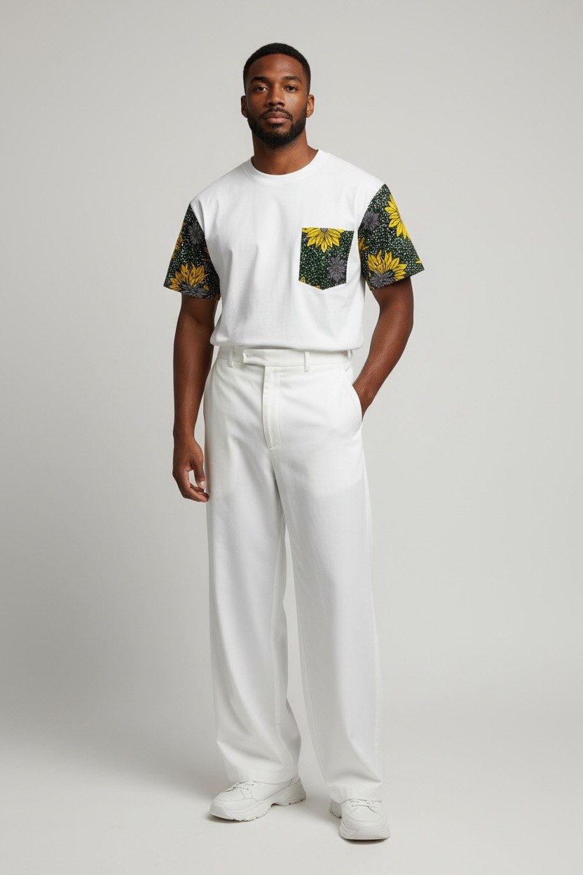 Men’s Premium White T-Shirt with Floral/Ankara Patch Sleeves & Pocket